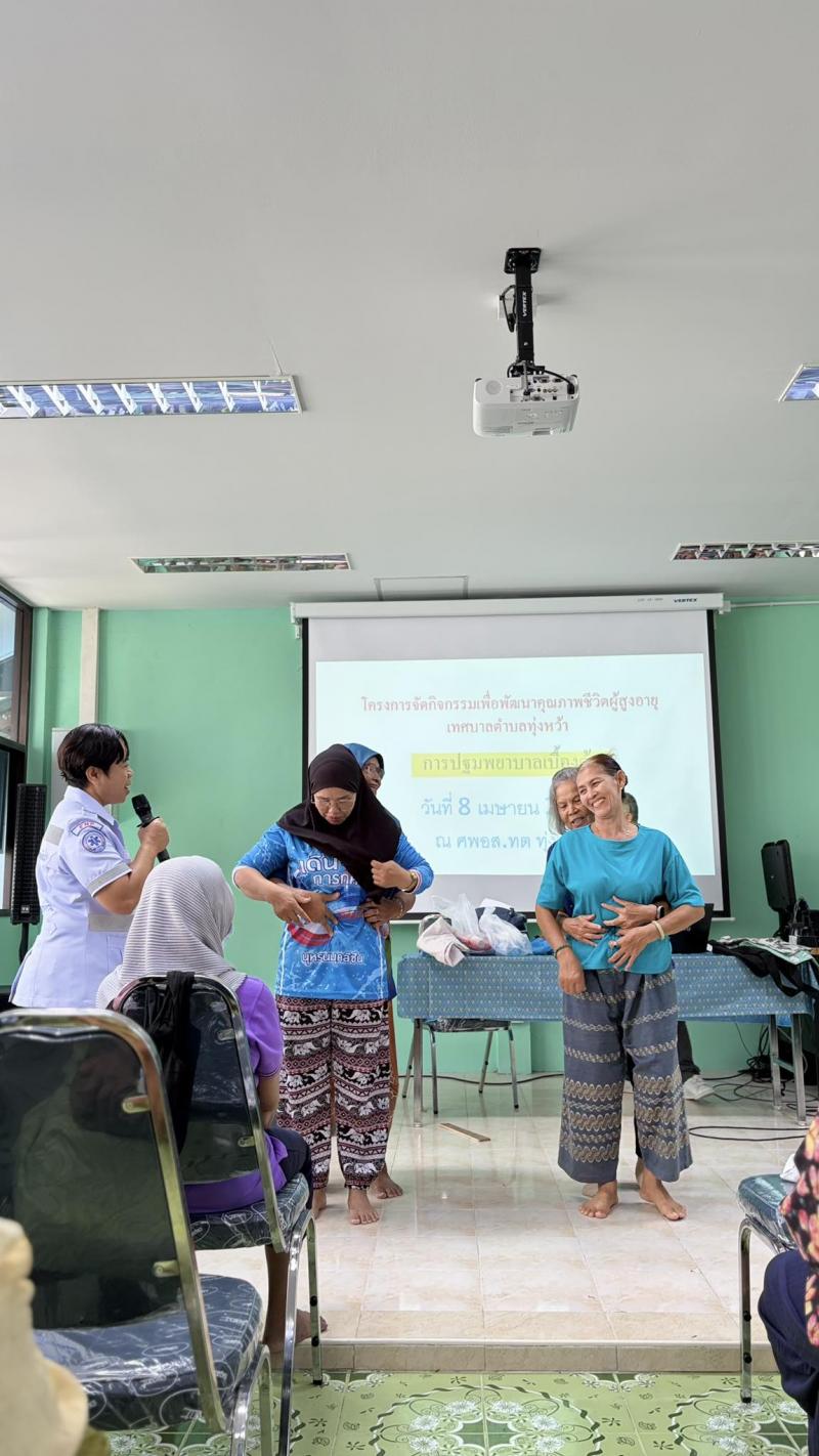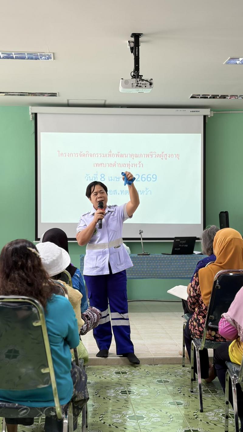 description เพื่อส่งเสริมให้ผู้สูงอายุได้พัฒนาตนเองทั้งทางด้านร่างกาย จิตใจ อารมณ์ สังคม และมีโอกาสแลกเปลี่ยนประสบการณ์ซึ่งกันและกัน ได้ตระหนักถึงการเข้าสู่สังคม ผู้สูงอายุอย่างมีคุณภาพ และได้มีโอกาสเข้าถึงสิทธิต่างๆที่พึงจะได้ได้รับการดูแลจากหน่วยงานภาครัฐต่อไป ซึ่งได้รับเกียรติจากวิทยากรเจ้าหน้าที่โรงพยาบาลทุ่งหว้า บรรยายหัวข้อ การปฐมพยาบาลเบื้องต้นสำหรับผู้สูงอายุ และวิทยากรผอ. สาธารณสุข อบจ.สตูล บรรยายหัวข้อ การจัดสภาพแวดล้อมที่เหมาะสมและที่พักอาศัยในวัยผู้สูงอายุ ณ ศูนย์พัฒนาคุณภาพชีวิตและส่งเสริมอาชีพผู้สูงอายุเทศบาลตำบลทุ่งหว้า person admin