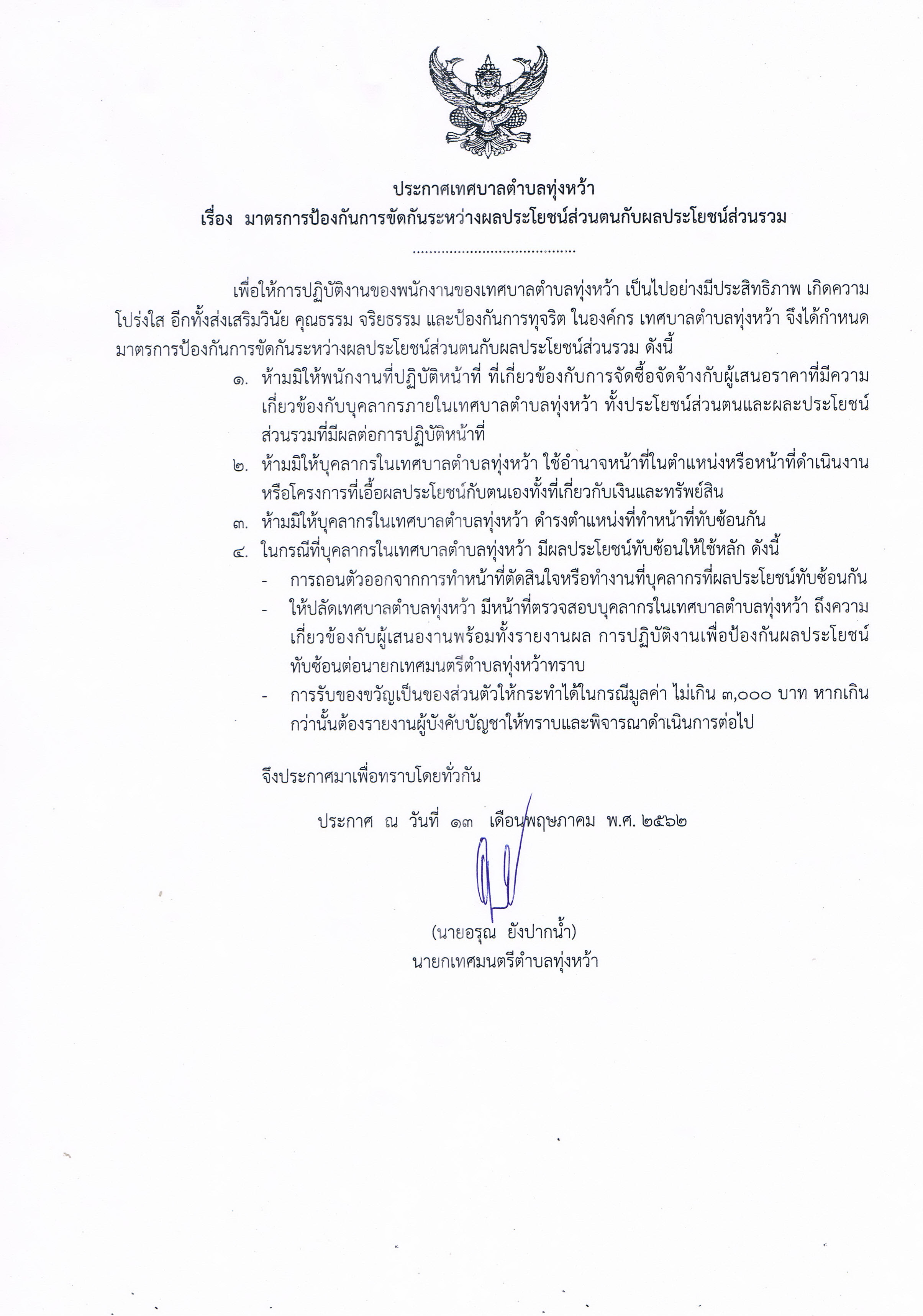 ประกาศเทศบาลตำบลทุ่งหว้า เรื่อง มาตรการป้องกันการขัดกันระหว่างผลประโยชน์ส่วนตนกับผลประโยชน์ส่วนรวม