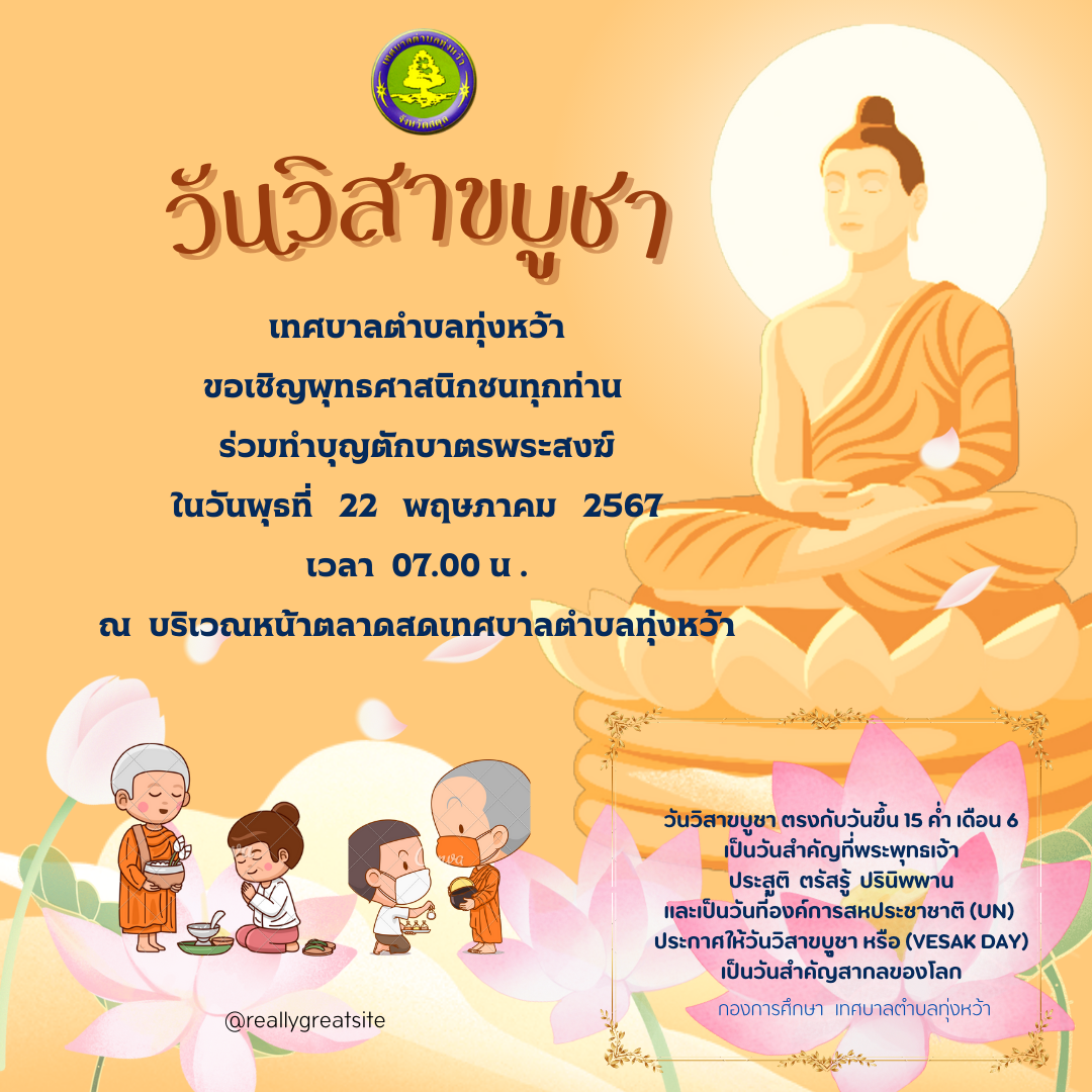 รายละเอียด : เทศบาลตำบลทุ่งหว้า ขอเชิญพุทธศาสนิกชนทุกท่านร่วมกิจกรรมทำบุญตักบาตรเนื่องในวันวิสาขบูชา ประจำปี 2567