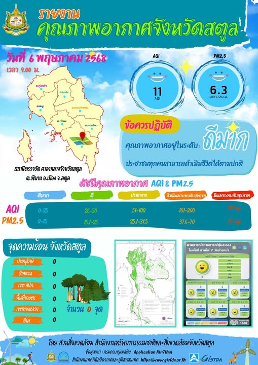 ชื่อเรื่อง : สถานการณ์ฝุ่นละออง PM2.5 ในพื้นที่จังหวัดสตูล ประจำวันที่ 6 พฤษภาคม 2568