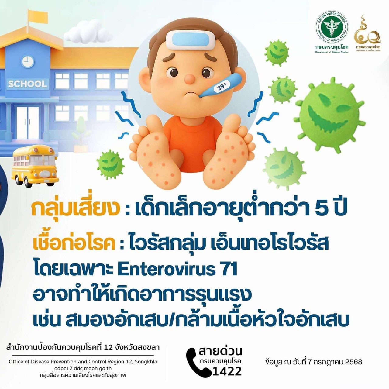 เชื้อก่อโรค: ไวรัสกลุ่ม เอ็นเทอโรไวรัส โดยเฉพาะ Enterovirus 71 อาจทำให้เกิดอาการรุนแรง เช่น สมองอักเสบ/กล้ามเนื้อหัวใจอักเสบ