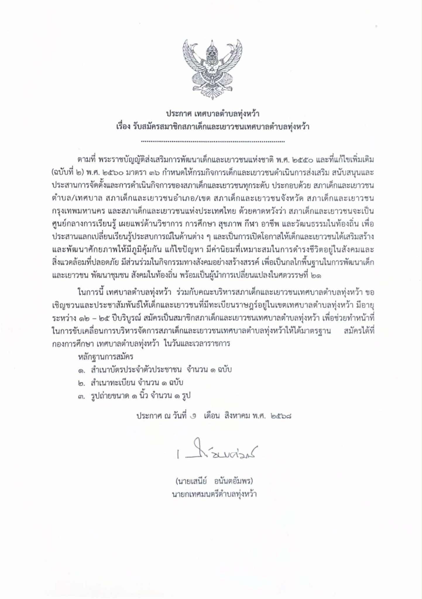 รายละเอียด : เทศบาลตำบลทุ่งหว้า ร่วมกับคณะบริหารสภาเด็กและเยาวชนเทศบาลตำบลทุ่งหว้า ขอเชิญชวนและประชาสัมพันธ์ให้เด็กและเยาวชนที่มีทะเบียนราษฎร์อยู่ในเขตเทศบาลตำบลทุ่งหว้า มีอายุระหว่าง 12-25 ปีบริบูรณ์ สมัครเป็นสมาชิกสภาเด็กและเยาวชนเทศบาลตำบลทุ่งหว้า เพื่อช่วยทำหน้าที่ในการขับเคลื่อนการบริหารการจัดการสภาเด็กและเยาวชนเทศบาลตำบลทุ่งหว้าให้ได้มาตรฐาน สมัครได้ที่กองการศึกษา เทศบาลตำบลทุ่งหว้า ในวันและเวลาราชการ ตั้งแต่บัดนี้เป็นต้นไป