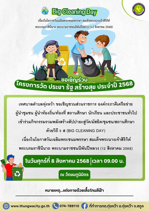 ในการนี้ เทศบาลตำบลทุ่งหว้า จึงขอเชิญชวนส่วนราชการ องค์กรภาคีเครือข่าย ผู้นำชุมชน ผู้นำท้องถิ่น/ท้องที่ สถานศึกษา นักเรียน และประชาชนทั่วไป เข้ากิจกรรม รวมพลังสร้างสัปปายะสู่วัด/มัสยิด/ชุมชน/สถานศึกษา ด้วยวิถี 5 ส. (Big Cleaning Day) เนื่องในโอกาสวันเฉลิมพระชนมพรรษา สมเด็จพระนางเจ้าสิริกิติ์ พระบรมราชินีนาถ พระบรมราชชนนีพันปีหลวง (12 สิงหาคม 2568) ในวันศุกร์ที่ 8 สิงหาคม 2568 เวลา 09.00 น. ณ วัดชมภูนิมิตร
