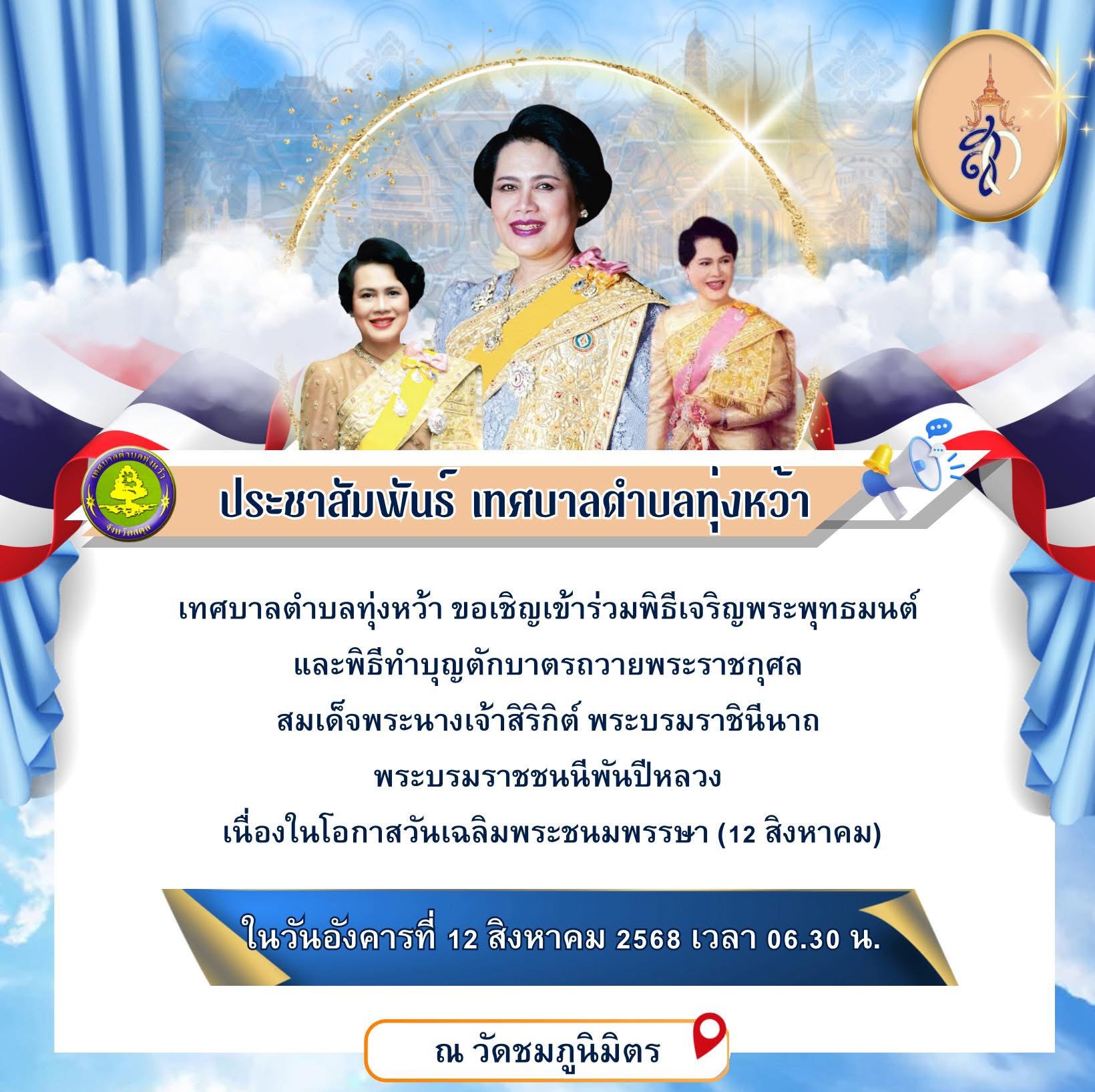 ชื่อเรื่อง: ประชาสัมพันธ์ เทศบาลตำบลทุ่งหว้าขอเชิญเข้าร่วมพิธีเจริญพุทธมนต์ และพิธีทำบุญตักบาตรถวายพระราชกุศล สมเด็จพระนางเจ้าสิริกิติ์ พระบรมราชินีนาถ พระบรมราชชนนีพันปีหลวง เนื่องในโอกาสวันเฉลิมพระชนมพรรษา (12 สิงหาคม) ในวันอังคารที่ 12 สิงหาคม 2568 เวลา 06.30 น. เป็นต้นไป ณ วัดชมภูนิมิตร