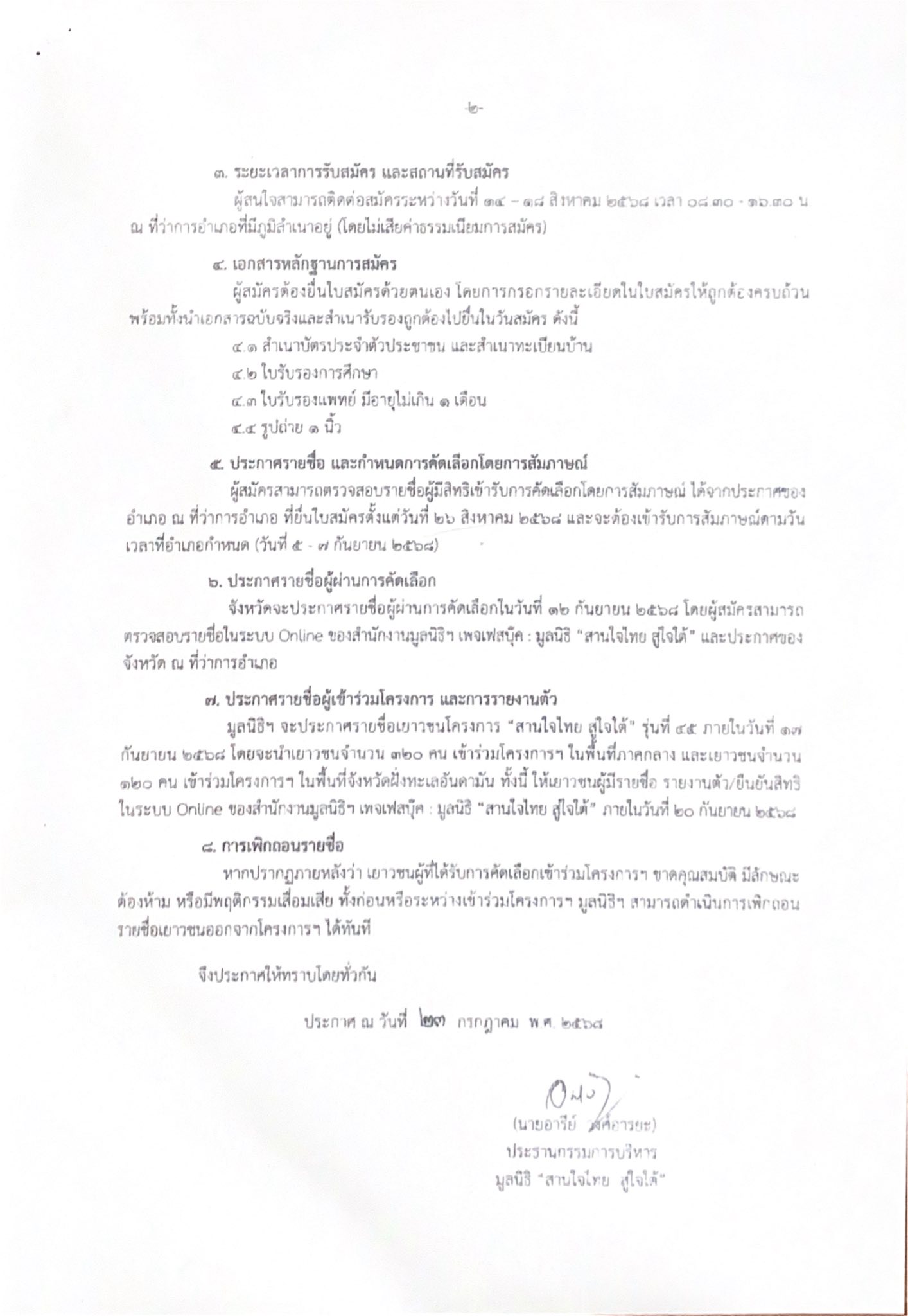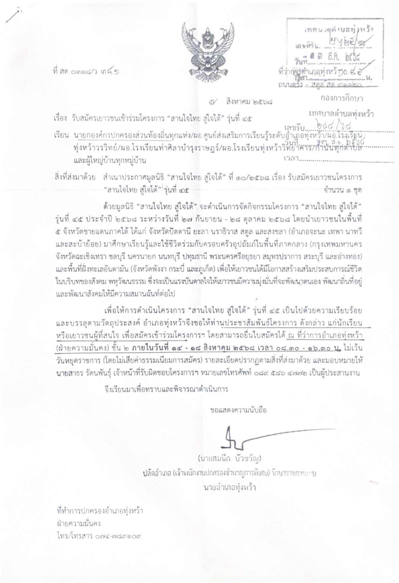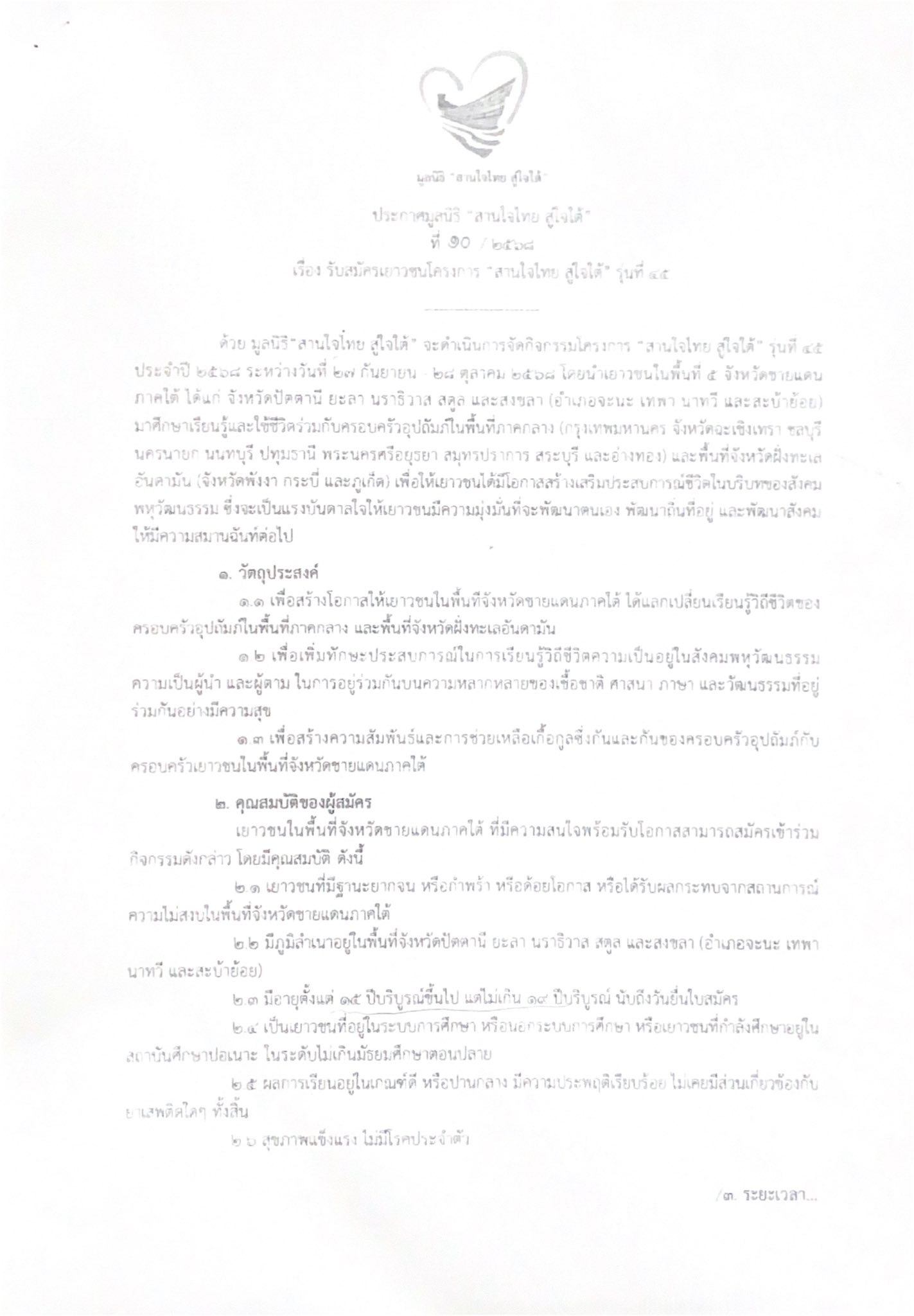 รับสมัครเยาวชนเข้าร่วมโครงการ “สานใจไทย สู่ใจใต้“ รุ่น 45