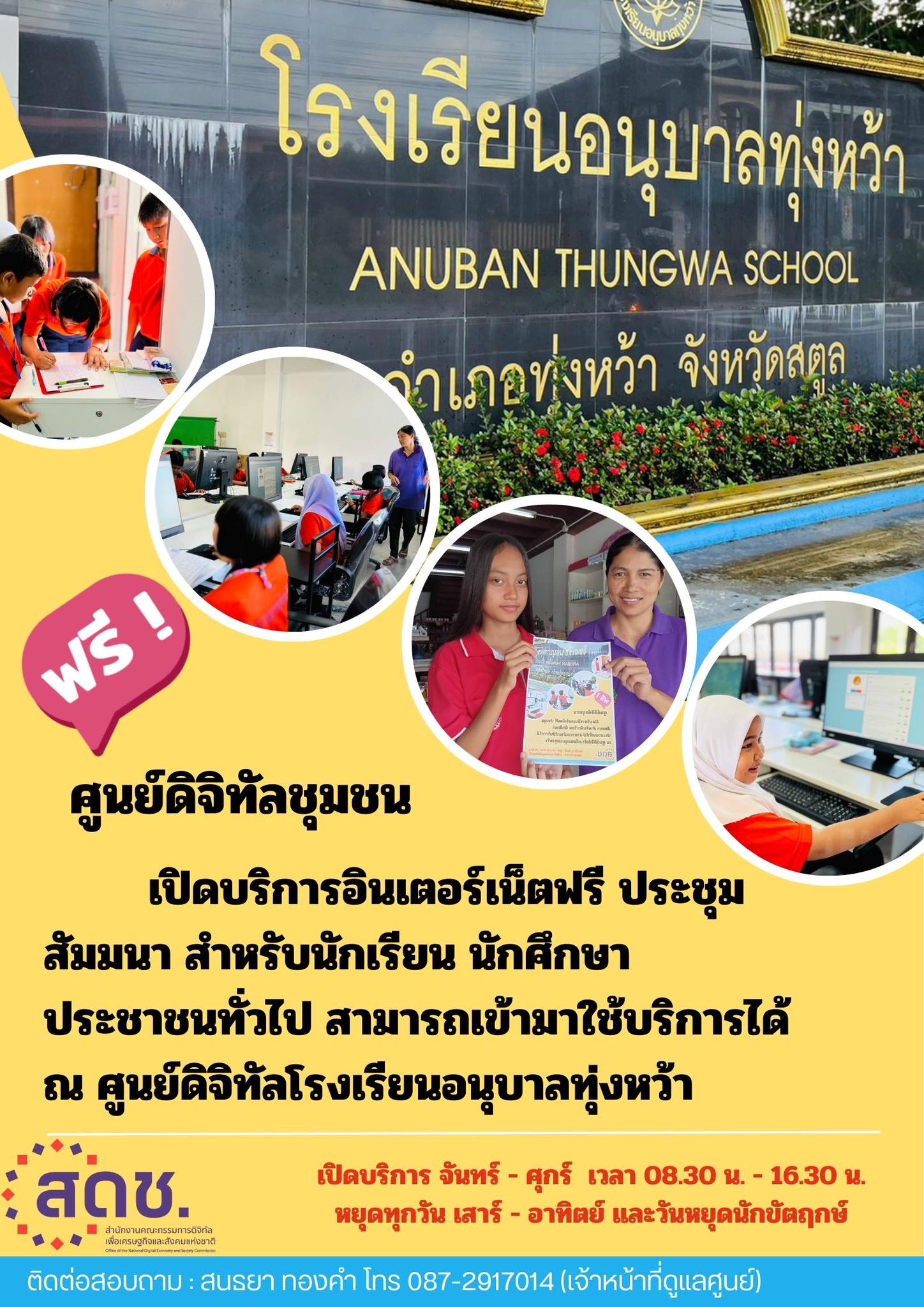 ศูนย์ดิจิทัลชุมชน เปิดบริการอินเตอร์เน็ตฟรี ประชุม สัมมนา สำหรับนักเรียน นักศึกษา ประชาชนทั่วไป สามารถเข้ามาใช้บริการได้ ณ ศูนย์ดิจิทัลโรงเรียนอนุบาลทุ่งหว้า
