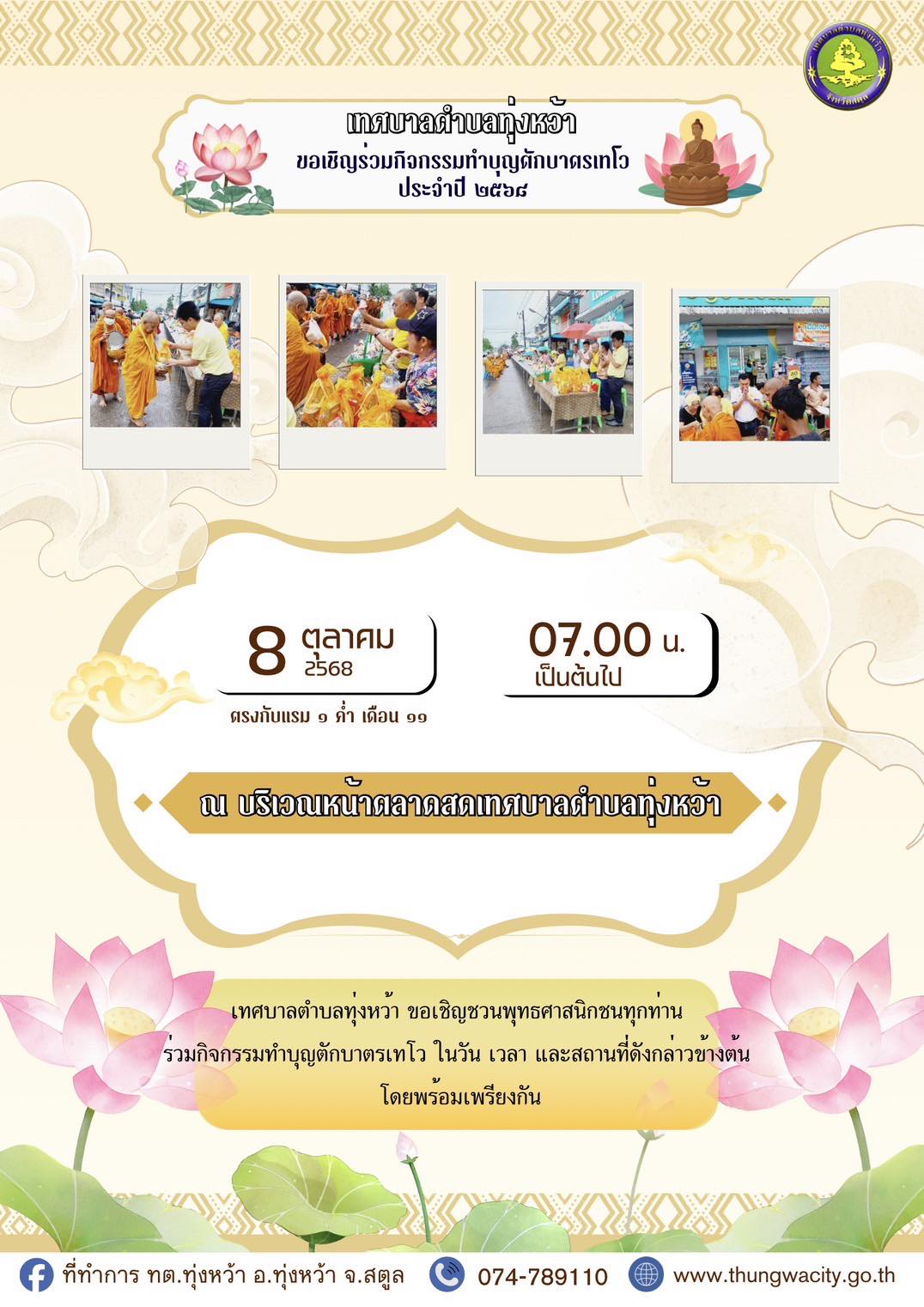 รายละเอียด : เทศบาลตำบลทุ่งหว้า กำหนดจัดกิจกรรมทำบุญตักบาตรเทโว ประจำปี 2568 ในวันพุธที่ 8 ตุลาคม 2568 ตรงกับแรม 1 ค่ำ เดือน 11 เวลา 07.00 น. ณ บริเวณหน้าตลาดสดเทศบาลตำบลทุ่งหว้า เทศบาลตำบลทุ่งหว้า จึงขอเชิญชวนพี่น้องพุทธศาสนิกชนทุกท่าน ร่วมกิจกรรมทำบุญตักบาตรเทโว ในวัน เวลา และสถานที่ดังกล่าวข้างต้น โดยพร้อมเพรียงกัน
