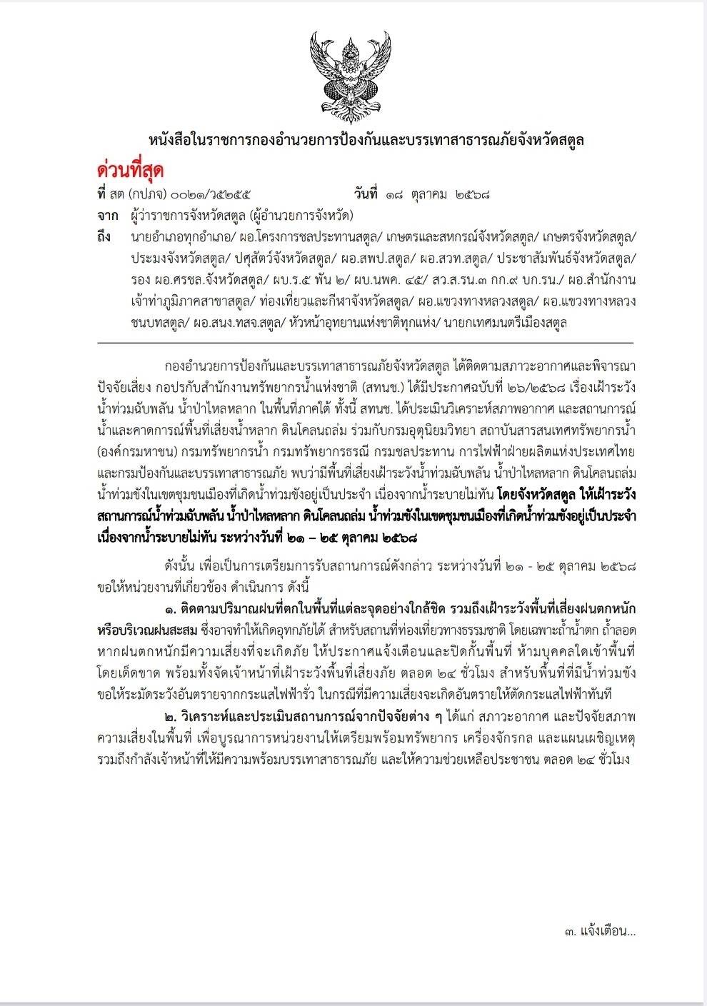 เฝ้าระวังสถานการณ์น้ำท่วมฉับพลัน น้ำป่าไหลหลาก ดินโคลนถล่ม ระหว่างวันที่ 21 – 25 ตุลาคม 2568