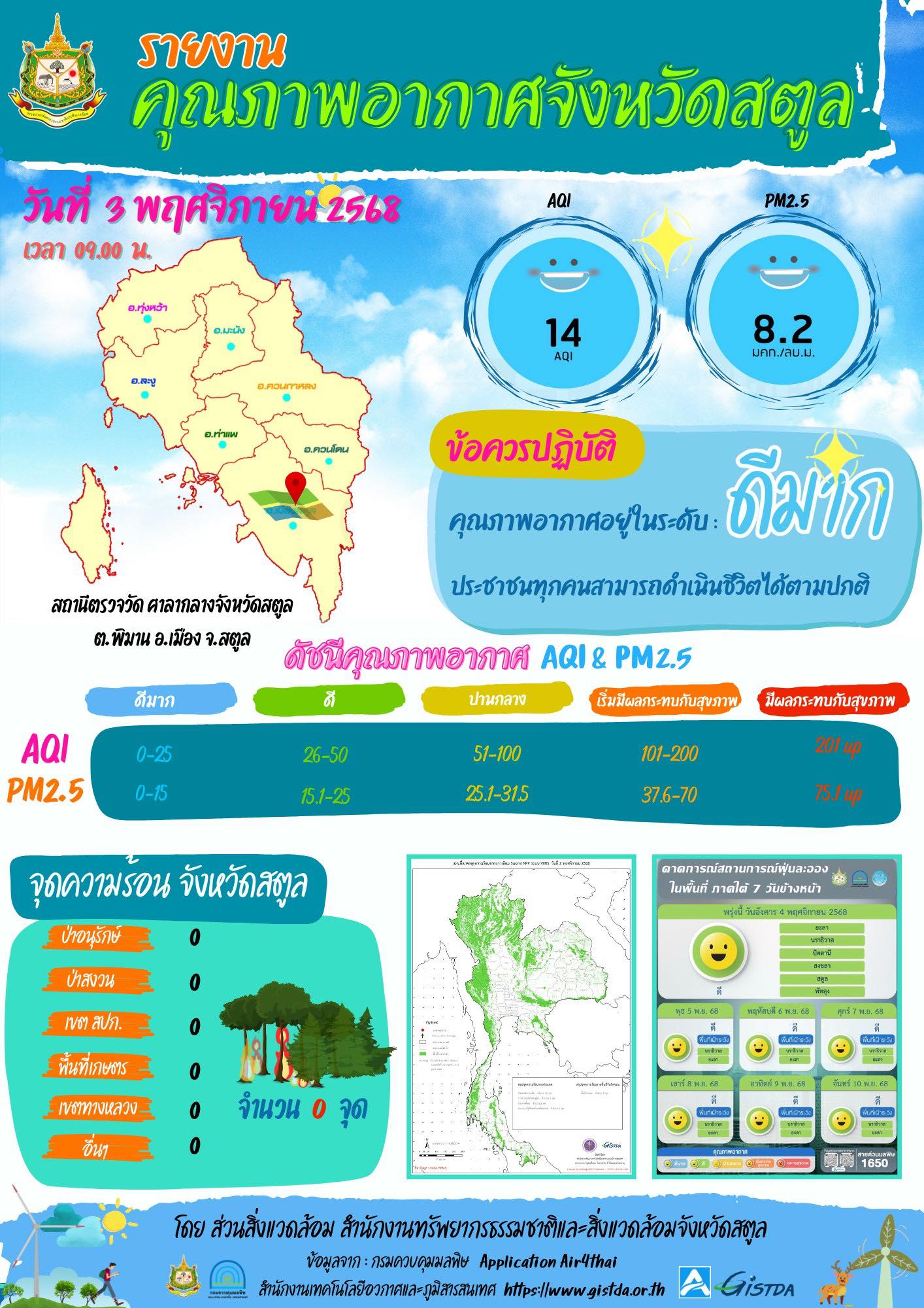 ชื่อเรื่อง : สถานการณ์ฝุ่นละออง PM2.5 ในพื้นที่จังหวัดสตูล ประจำวันที่ 3 พฤศจิกายน 2568 เวลา 09.00 น