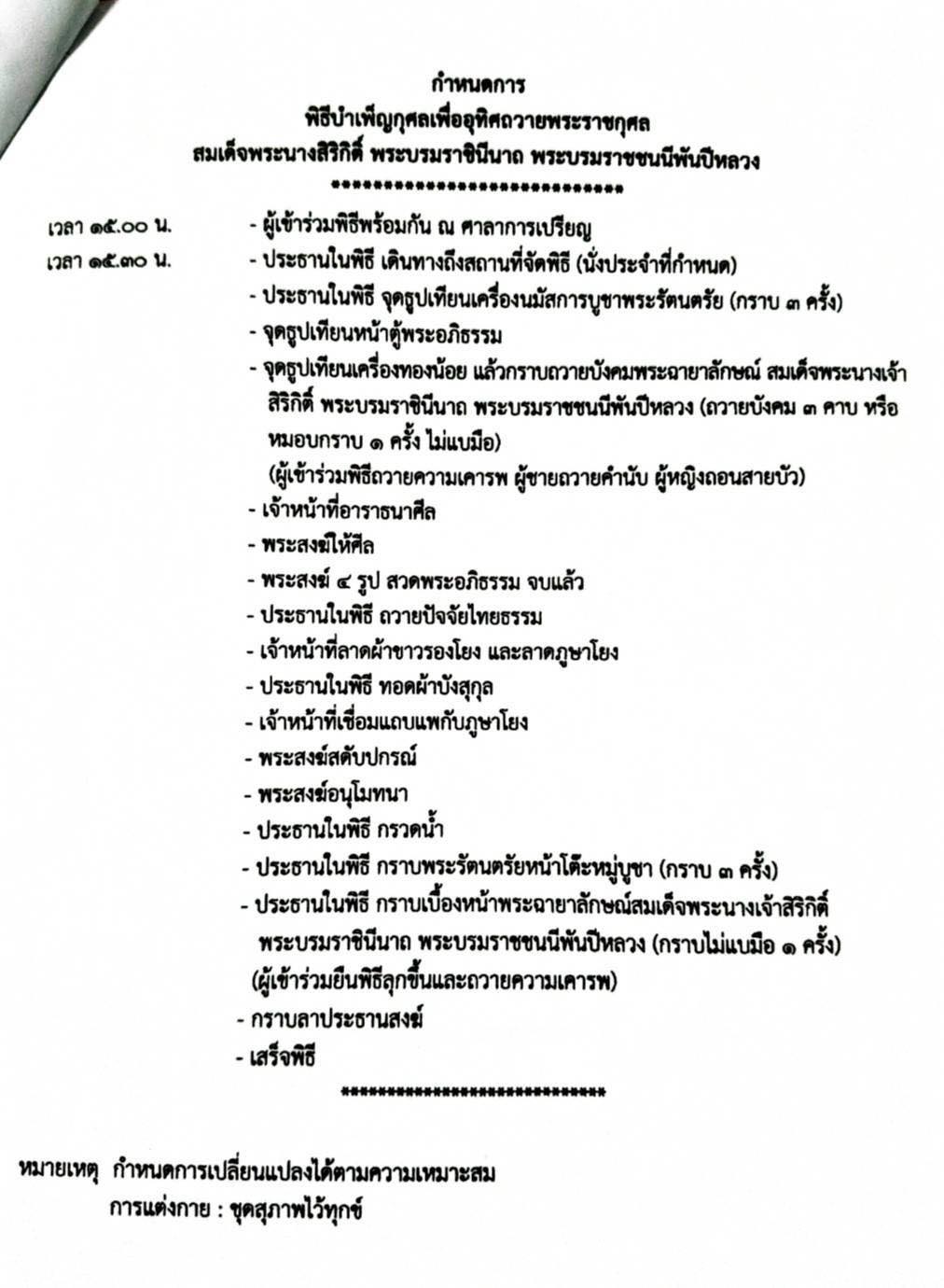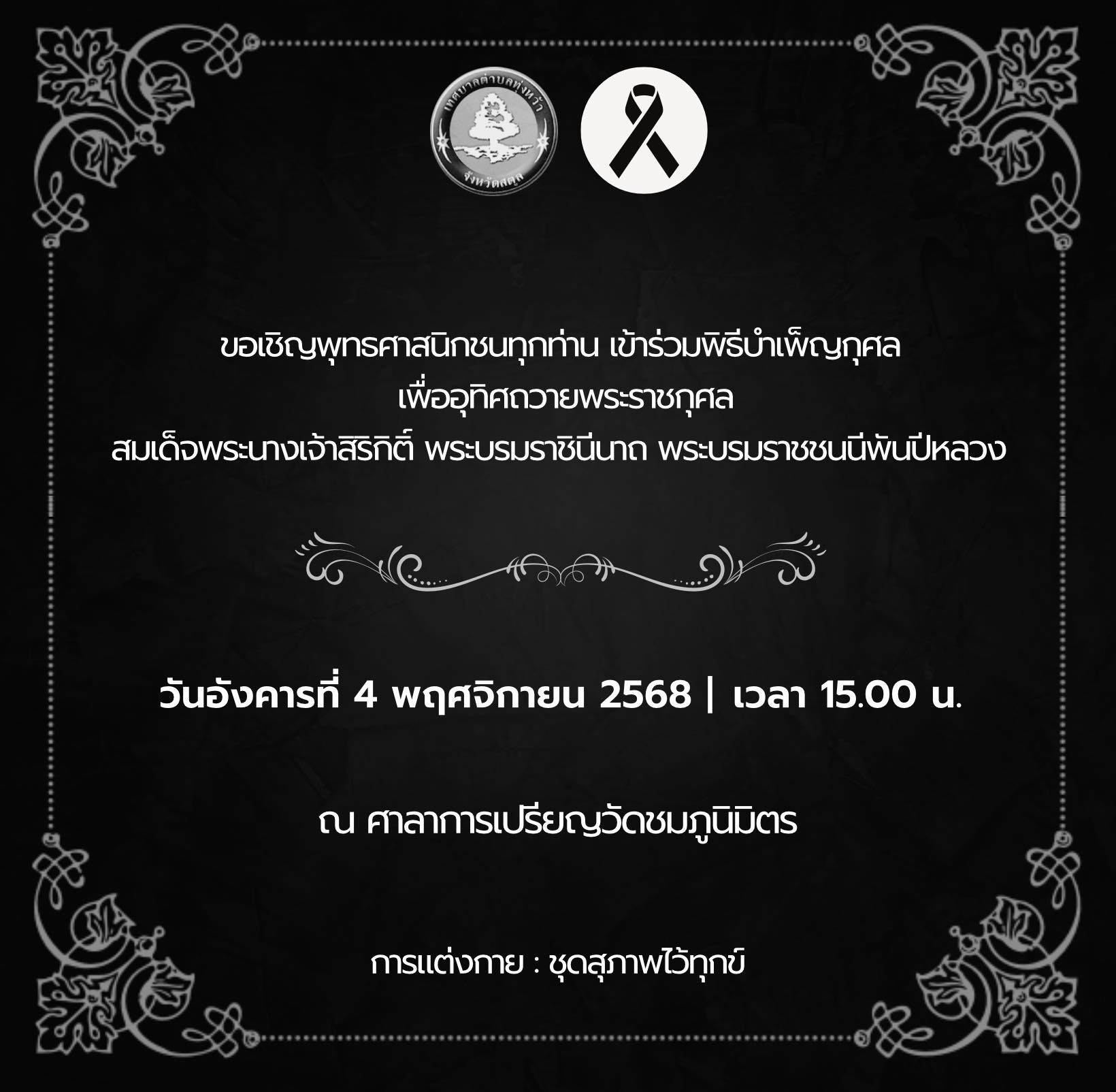ชื่อเรื่อง : ขอเชิญพุทธศาสนิกชนทุกท่าน เข้าร่วมพิธีบำเพ็ญกุศล เพื่ออุทิศถวายพระกุศล สมเด็จพระนางเจ้าสิริกิติ์ พระบรมราชินีนาถ พระบรมราชชนนีพันปีหลวง