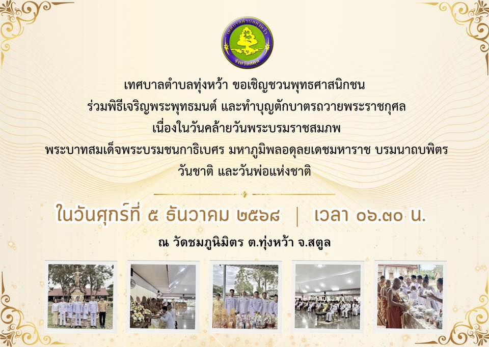 เทศบาลตำบลทุ่งหว้า ขอเชิญชวนพุทธศาสนิกชน ร่วมพิธีเจริญพระพุทธมนต์และทำบุญตักบาตรถวายพระราชกุศล เนื่องในวันคล้ายวันพระบรมราชสมภพ พระบาทสมเด็จพระบรมชนกาธิเบศร มหาภูมิพลอดุลยเดชมหาราช บรมนาถบพิตร “วันชาติ และวันพ่อแห่งชาติ”