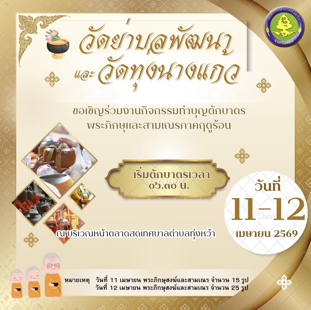 เทศบาลตำบลทุ่งหว้าขอเชิญชวนพุทธศาสนิกชนทุกท่านร่วมทำบุญตักบาตร สามเณรฤดูร้อน