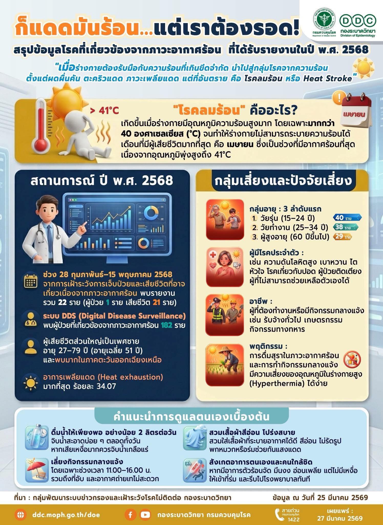 เมื่ออากาศร้อนคือภัยสุขภาพที่ต้องเฝ้าระวัง กองระบาดวิทยา สรุปสถานการณ์ข้อมูลการเฝ้าระวังอาการเจ็บป่วยและเสียชีวิตที่เกี่ยวข้องจากภาวะอากาศร้อน ในช่วงวันที่ 28 ก.พ. - 15 พ.ค. 2568 เพื่อใช้ข้อมูลเป็นตัวสื่อสารให้ไม่ประมาทกับฤดูร้อนนี้ รวมถึงรู้เท่าทันความเสี่ยง และการป้องกัน