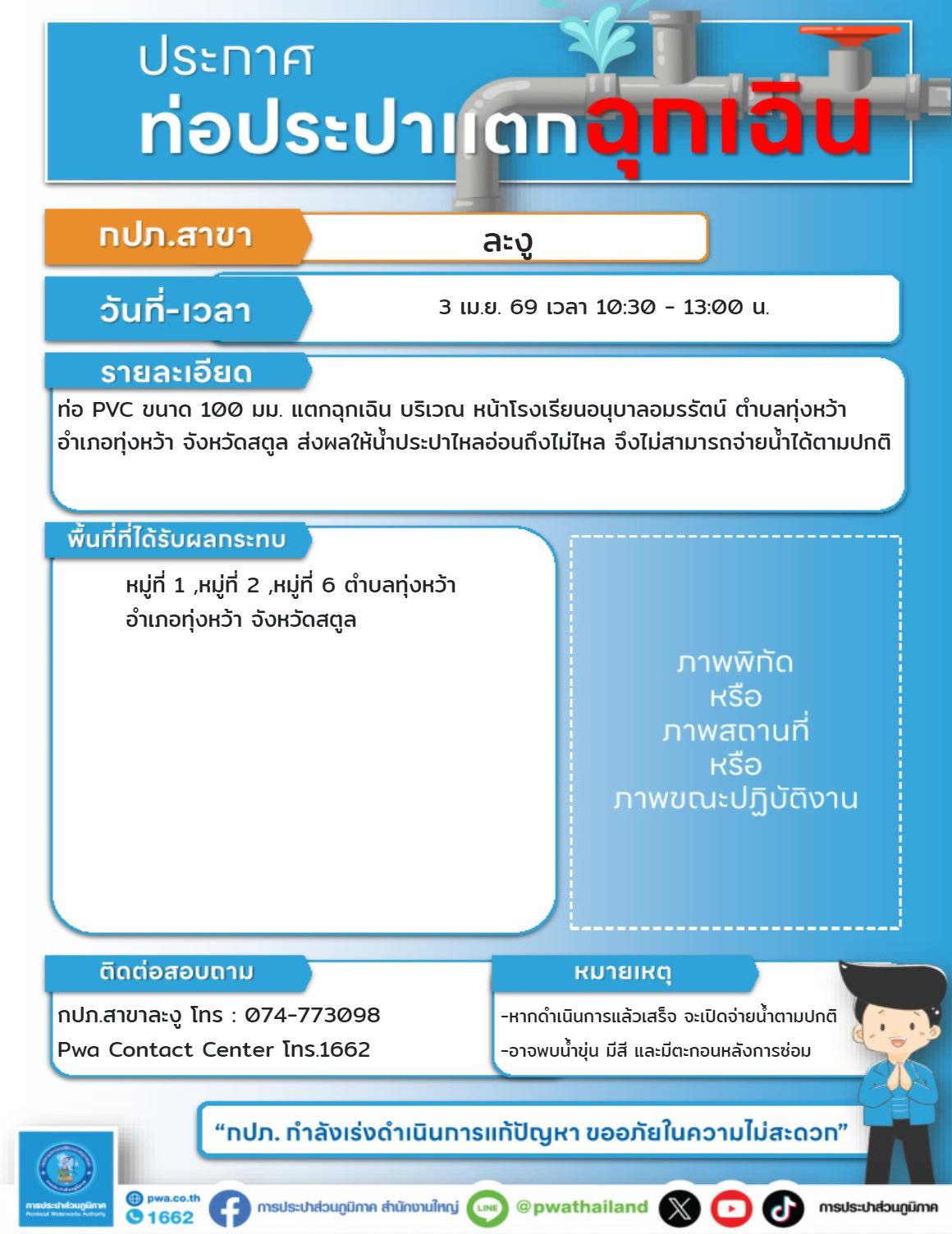 ประกาศท่อประปาแตกฉุกเฉิน บริเวณหน้าโรงเรียนอนุบาลอมรรัตน์ ตำบลทุ่งหว้า อำเภอทุ่งหว้า จังหวัดสตูล  ม.1 ม.2 และ ม.6