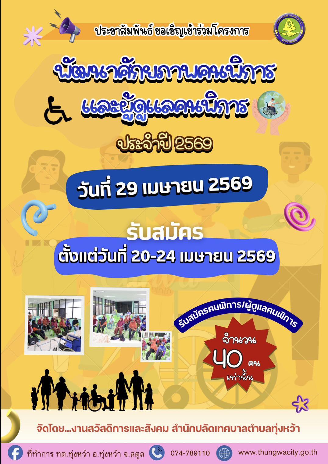 งานสวัสดิการและสังคมเทศบาลตำบลทุ่งหว้า ขอเชิญเข้าร่วมโครงการพัฒนาศักยภาพคนพิการและผู้ดูแลคนพิการ ประจำปี 2569 ในวันที่ 29 เมษายน 2569 โดยรับสมัครตั้งแต่วันที่ 20-24 เมษายน 2569