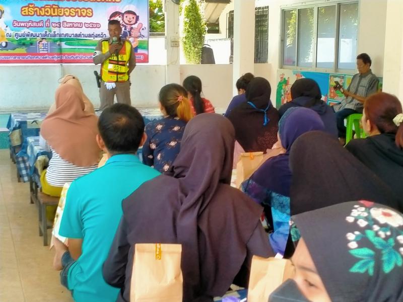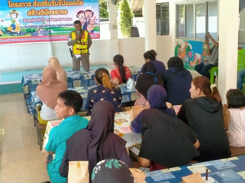 โครงการ ส่งเสริมขับขี่ปลอดภัยสร้างวินัยจราจร วันพฤหัสบดี ที่ 24 สิงหาคม 2566 ณ ศูนย์พัฒนาเด็กเล็กเทศบาลตำบลทุ่งหว้า