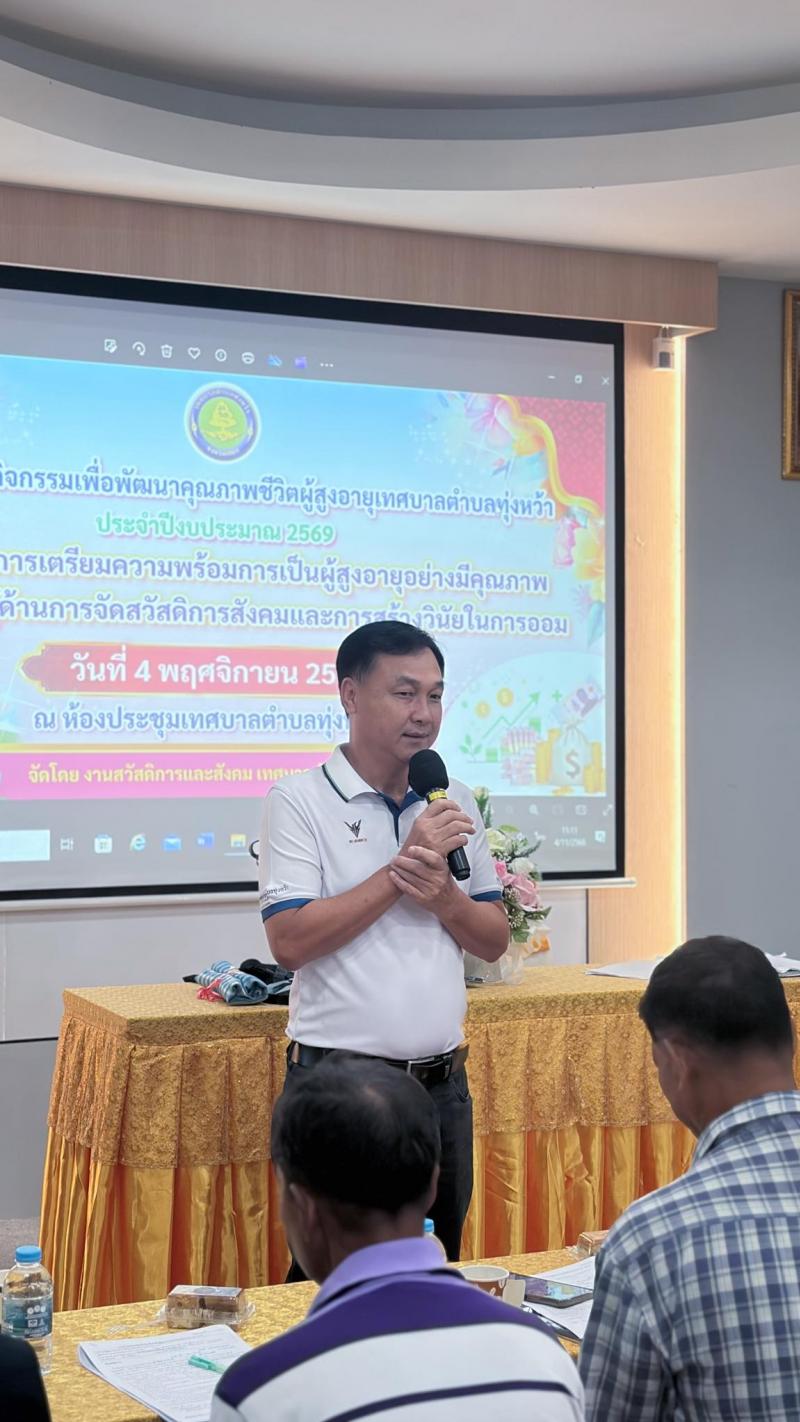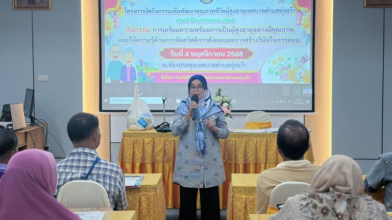 รายละเอียด : กิจกรรมการเตรียมความพร้อมการเป็นผู้สูงอายุอย่างมีคุณภาพและให้ความรู้ด้านการจัดสวัสดิการสังคมและการสร้างวินัยในการออม ณ ห้องประชุมเทศบาลตำบลทุ่งหว้า จัดโดยงานสวัสดิการและสังคมเทศบาลตำบลทุ่งหว้า