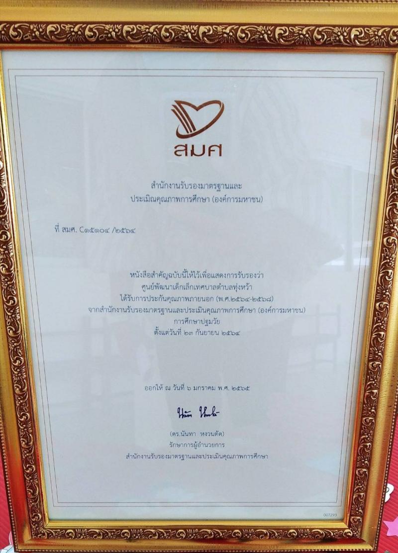 ศูนย์พัฒนาเด็กเล็กเทศบาลตำบลทุ่งหว้า ได้รับการประกันคุณภาพภายนอก (พ.ศ. 2564 - พ.ศ. 2568) จากสำนักงานรับรองมาตรฐานและประเมินคุณภาพการศึกษา (3 ภาพ)