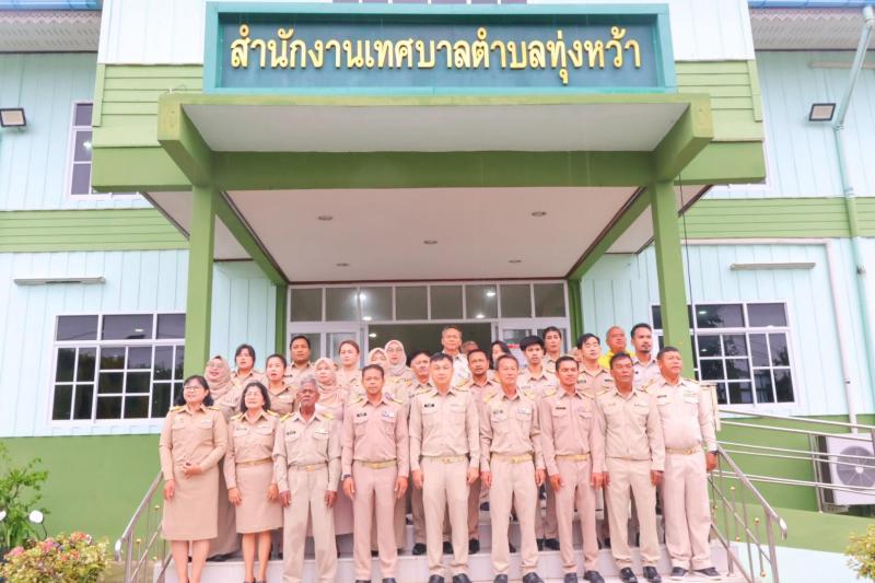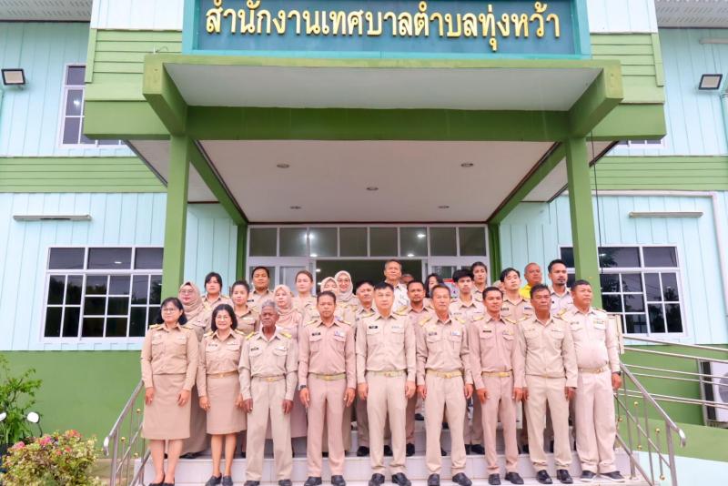 รายละเอียด : นายเสนีย์ อนันตอัมพร นายกเทศมนตรีตำบลทุ่งหว้า สมาชิกสภาฯ คณะผู้บริหาร หัวหน้าส่วนราชการ ข้าราชการ และเจ้าหน้าที่ ร่วมกิจกรรมเคารพธงชาติและร้องเพลงชาติไทย เนื่องในวันพระราชทานธงชาติไทย (Thai National Flag Day) ประจำปี 2568 โดยพร้อมใจกันยืนตรงเคารพธงชาติอย่างพร้อมเพรียง ณ บริเวณหน้าสำนักงานเทศบาลตำบลทุ่งหว้า ท่ามกลางสภาพอากาศมีฝนโปรยปราย แต่ทุกคนยังคงยืนตรงอย่างสง่างามและแสดงออกถึงความเคารพต่อธงชาติไทย