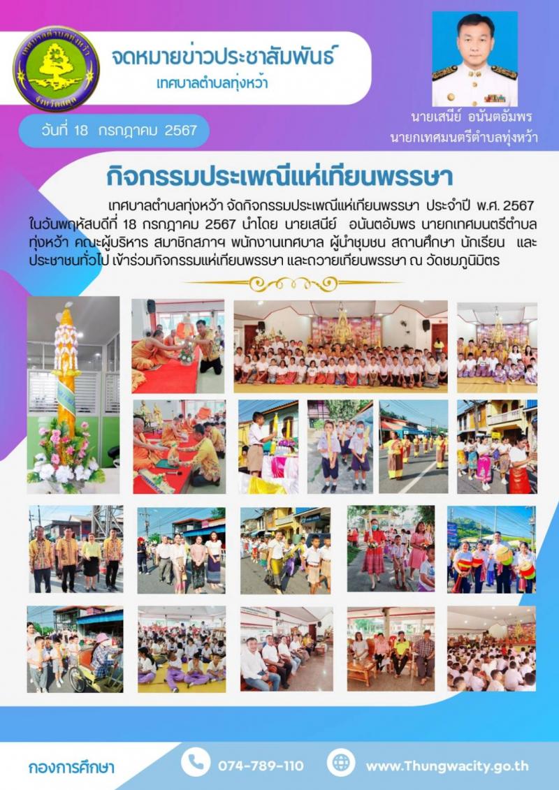 รายละเอียด : เทศบาลตำบลทุ่งหว้า จัดกิจกรรมประเพณีแห่เทียนพรรษา ประจำปี 2567 ในวันที่ 18 กรกฎาคม 2567 เวลา 08.00 น. และประกอบพิธีถวายเทียนพรรษา เวลา 09.30 น. ณ วัดชมภูนิมิตร นำโดย นายเสนีย์ อนันตอัมพร นายกเทศมนตรีตำบลทุ่งหว้า คณะผู้บริหาร สมาชิกสภาฯ ข้าราชการ พนักงานเทศบาล สถานศึกษา และประชาชนทั่วไป เทศบาลตำบลทุ่งหว้าขอขอบคุณทุกภาคส่วนที่ร่วมกิจกรรมในครั้งนี้