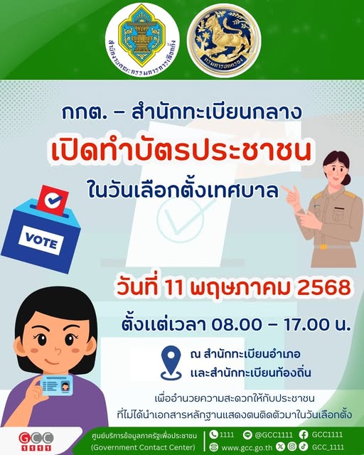 ชื่อเรื่อง : กกต. ร่วมกับ สำนักทะเบียนกลาง อำนวยความสะดวกเปิดทำบัตรประชาชนในวันเลือกตั้งเทศบาล 11 พฤษภาคม 2568